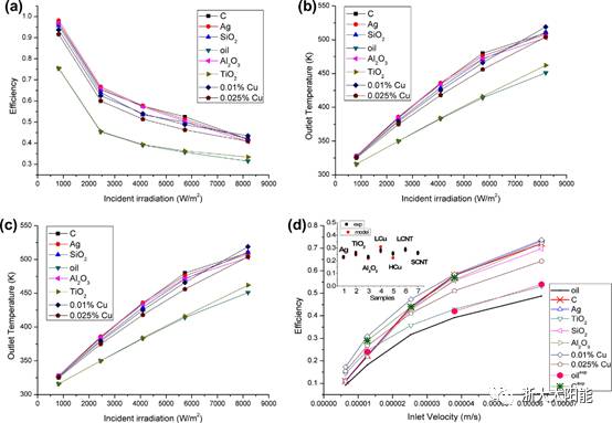 图5(b)表明出口温度随着入射辐射强度的增加而增加。除TiO2以外,纳米流体的出口温度比油基流体有明显的改善。入射辐射量增加时,不同纳米流体的出口温度差别变大,最大差值在25K以内。当入射辐射强度为8000W / m2时,出口温度最多升高70K。图5(c)显示出口温度随入口速度的增加而降低。如图5(d)所示,在不同入口速度下,效率可提高2-25%。