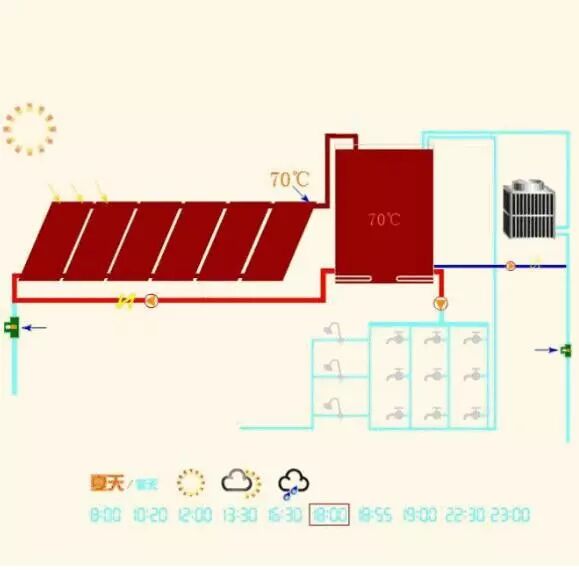 1、太阳能照射真空管,真空管集热器把水加热,通过循环系统将热水储存在保温水箱中。如下图所示:集热器可以将水加热到50度,此时红色箭头所示为加热水循环,水温可达到系统要求,所以电加热是关闭的状态;