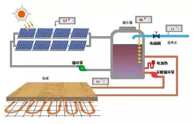 太阳能采暖系统主要由真空管集热器、储热保温水箱、地板采暖系统以及控制系统等组成,可分为以下三个部分了解整体系统的运行: