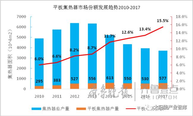 报告认为,平板太阳能集热器将主导行业技术创新和市场应用。从市场份额的变化来看,在过去的7年,平板太阳能集热器的市场份额一直在提高,从2010年的6%提高到2017年的15.5%,平板太阳能在热水市场的竞争力逐渐增强。按照此趋势预测,到2022年,平板太阳能集热器的市场份额将达到29.9%,总安装量将达到1119万平米,长远来看,预计到2030年,平板太阳能集热器的市场份额将达到51.8%,总安装量将达到3178万平米。