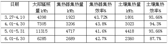 (1)4、5、6月份蓄热期间,蓄热体中心温度由13℃上升到39℃,蓄热率约为90%;太阳集热器的日平均集热效率约为42%,在太阳辐照充足条件下(24MJ/㎡),日平均换热功率达到16.8kW,地埋管单位换热功率约为100W/m。地埋管相对较高的进水温度可以提高换热效率。