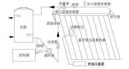 太阳能集热系统安装在用户房屋楼顶,主要由非承压真空管太阳集热器,循环水泵和水箱组成。其系统示意图如图2所示。集热介质(水)在循环水泵的作用下,从水箱底部开始流入集热器,吸收太阳辐射热后流回水箱顶部。系统设计思想为:非采暖季节,太阳能集热器收集的热量通过地下换热器存储到土壤中,为冬季建筑采暖提供部分热源。系统设计包括太阳能集热器的选型、集热器面积的确定、缓冲水箱容积确定,集热循环水泵的选择、控制及计量系统的选择等。