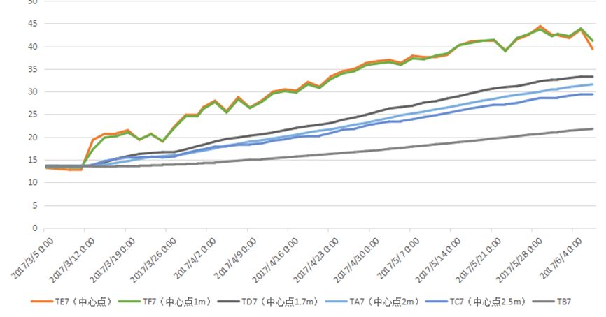 图6为土壤深度7m、不同位置(距中心点0m、1m、1.7m、2m)的温度分布图,其中TE和TF分别与地埋管11、4共用一口井,考虑TE和TF土壤温度受地埋管影响,因此时间点取凌晨5:00的温度,尽可能避免地埋管白天换热温度对土壤温度的影响。从图8中可以看出,随着蓄热的不断进行,热量通过地埋管换热器传递给竖井,使蓄热体内部不同范围土壤温度均有升高。同一时刻蓄热区中心温度最高,并呈现出依次向外温度越低的趋势,由图可知,在尚未蓄热前(3月12日以前),土壤7m处不同区域温度都为13℃,经过4、5、6月份的蓄热过程,中心点观测井e,地下7m处土壤温度上升了△27℃,达到了40℃。在距离蓄热中心1.7m的观测井d,地下7m处土壤温度也上升了△16℃,达到了29℃。且观测井d时独立监测井,与地埋管间距较远,不受地埋管温度的影响。观测井a(2m)、观测井c(2.5m)的分别为与上述观测井d的温升趋势较为接近,而离中心最远的观测井b(3m),测温升趋势则不是很明显。由此推断该蓄热提的热力范围在2.5m-3m之间。